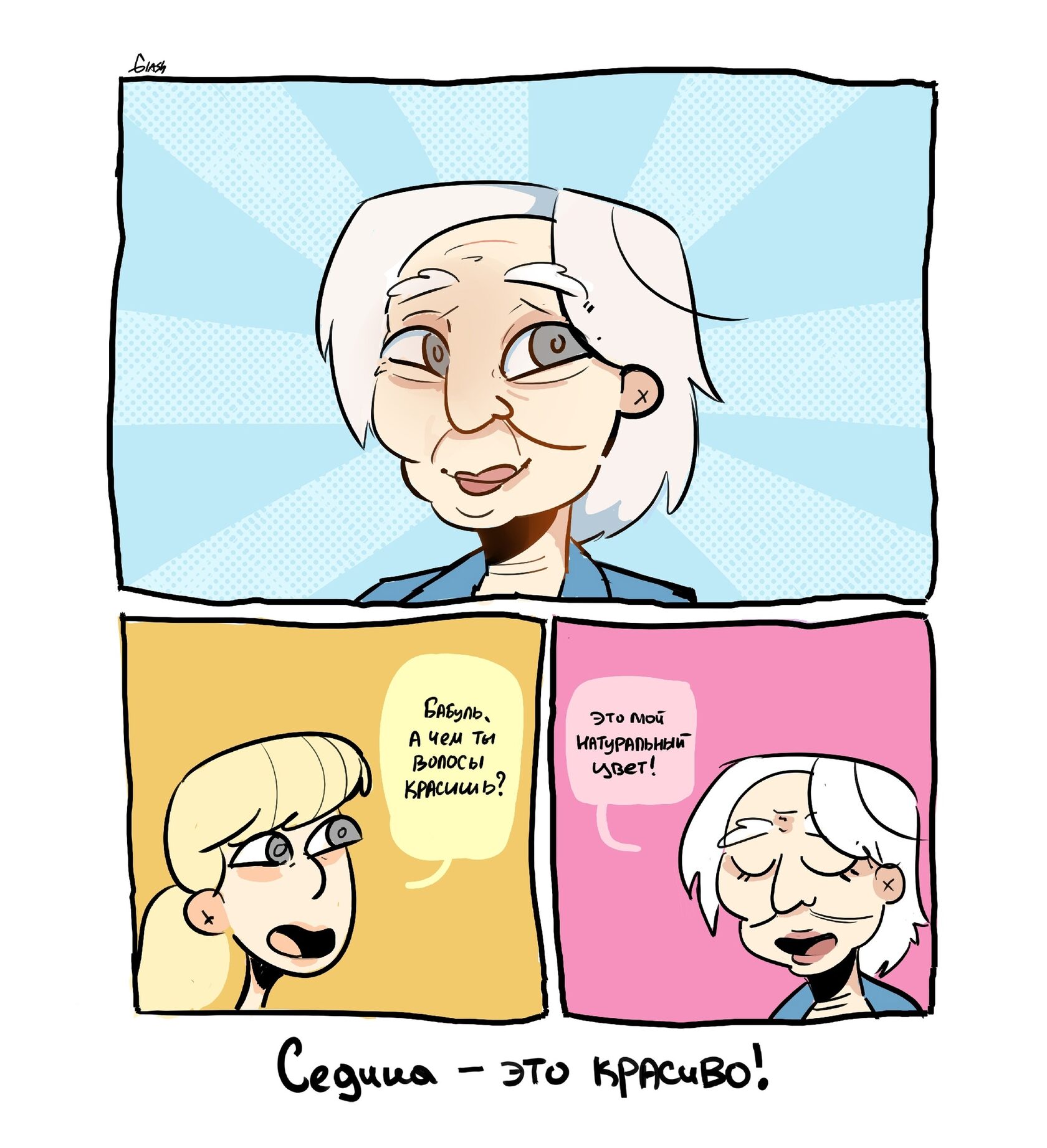 Моя бабушка научила меня не бояться и не стесняться седых волос, отсюда получился такой забавный диалог.