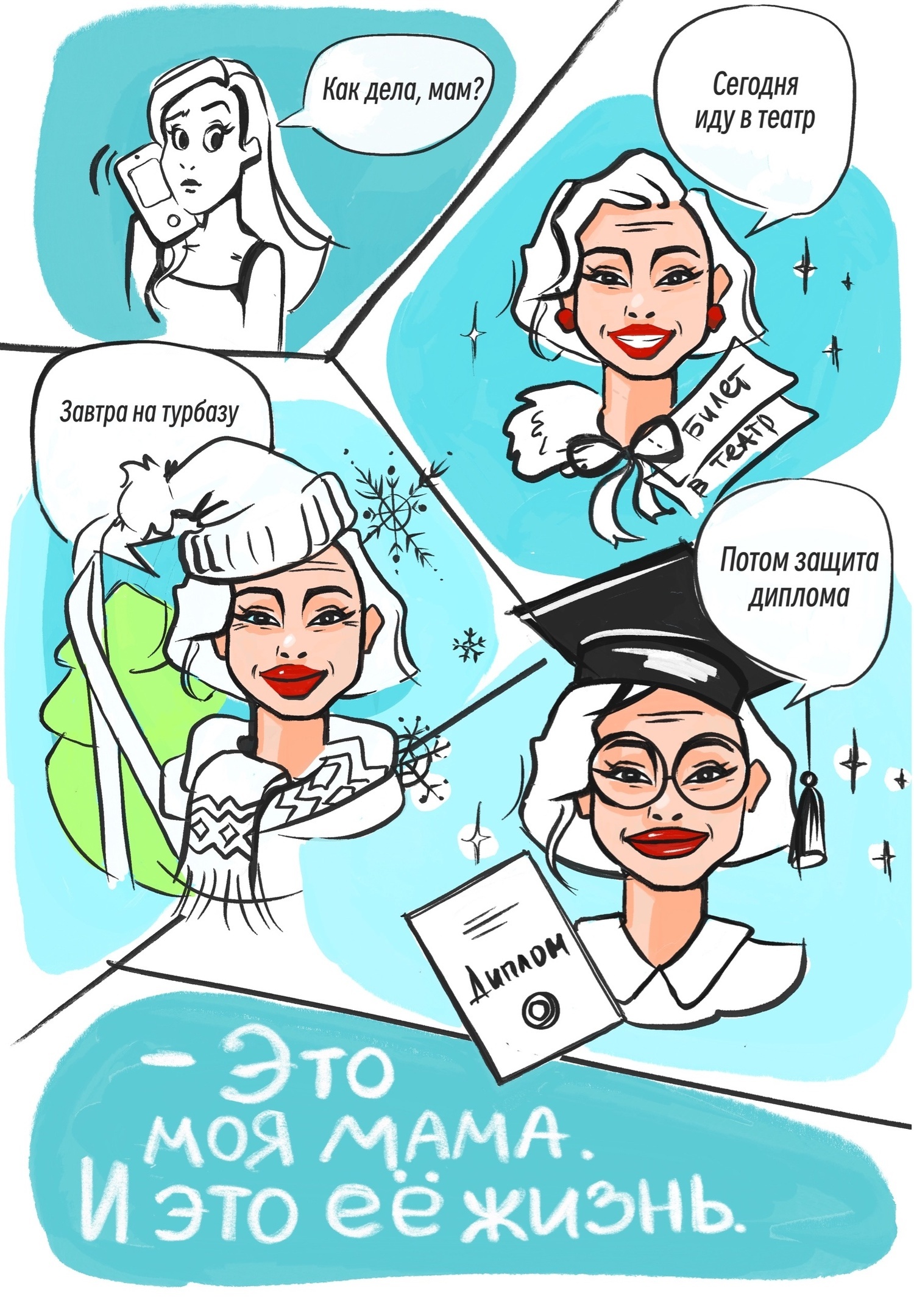 Концепция моего комикса заключается в том, чтобы показать яркую и насыщенную событиями жизнь женщины 61 года. Самое прекрасное в том, что мне не пришлось ничего придумывать. Это правдивая иллюстрация жизни моей мамы.